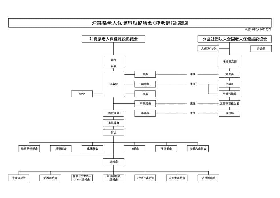 TOP > 協議会概要 協議会概要 協議会概要 沖縄県老人保健施設協議会(同時に現在の公益社団法人全国老人保健施設協会沖縄県支部となる)は平成3年に発足しました。 沖縄県に初めて老健施設が誕生したのが平成元年で、発足当初は8施設の老健施設がありました。 現在では離島を合わせ43施設となりました。当協議会にはそのほとんどの施設が入会し、会員施設連携しながらサービスの質の向上、職員の育成など活発な活動を行っています。 組織図 組織図 TOP ごあいさつ 老健(ろうけん)とは 協議会の概要 会員施設 災害時支援体制 電子ツールによる情報共有 介護老人保健施設大会 研修会 広報誌「老健うちなぁ」 LINK(リンク) 会員専用A(事務長会事前) 会員専用B(会議依頼文書) 会員専用C(会議室借用) 会員専用D(変更届)