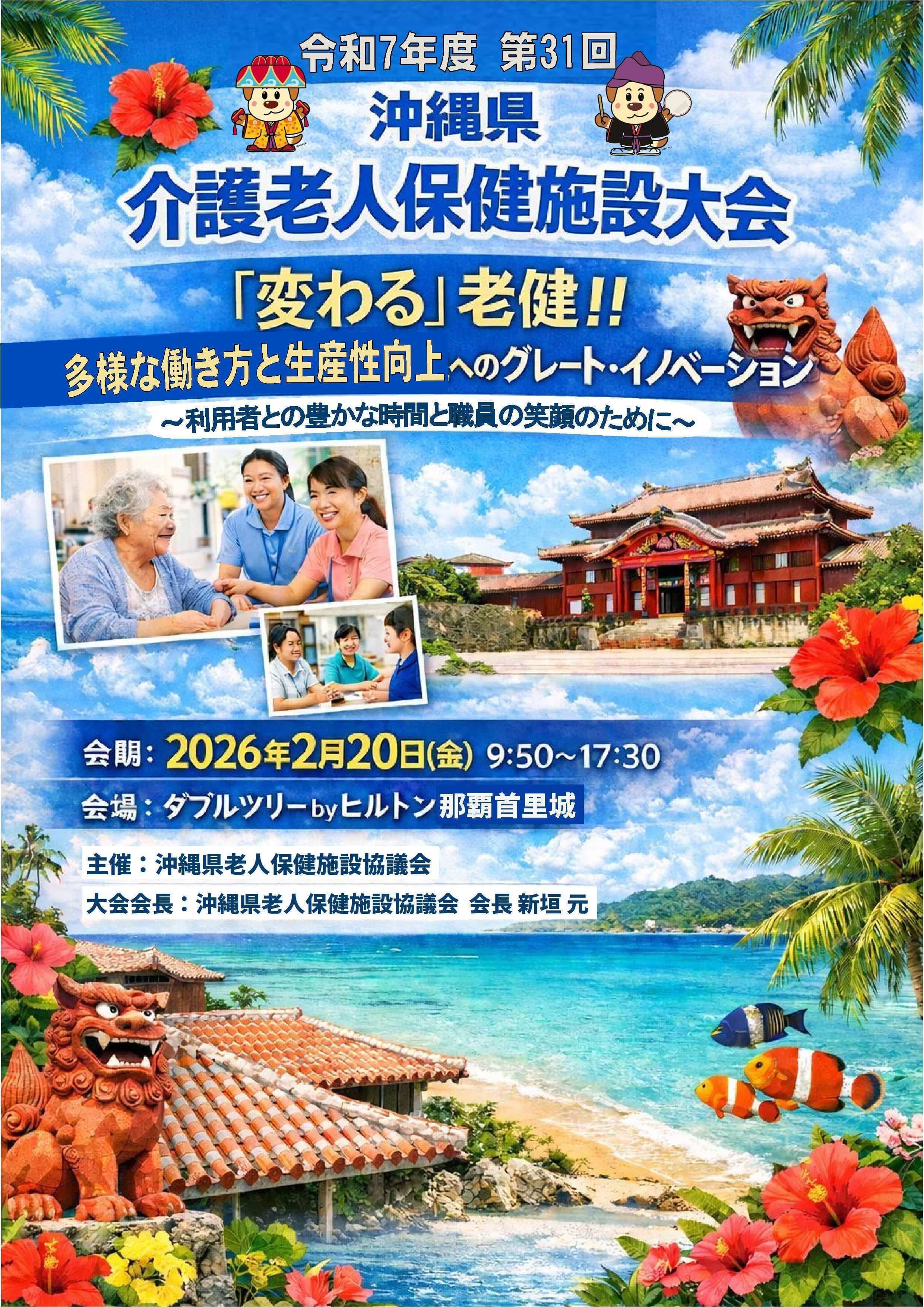 TOP > 介護老人保健施設大会 終了 介護老人保健施設大会 ●県内大会 令和7年度 第31回沖縄県介護老人保健施設大会 会期:2026年2月20日(金) 場所:ダブルツリーbyヒルトン 那覇首里城 第31回沖縄県介護老人保健施設大会は成功裏に終了しました 充実した内容ばかりで、素晴らしい大会となりましたね 【会長賞】信成苑、【副会長賞】西原敬愛園、いしかわ願寿ぬ森 の皆さん、おめでとうございました! 全体的に充実した内容ばかりで、素晴らしい大会となりました! 今回の発表を、九州ブロック長崎大会や、全国栃木大会でも発表を目指して下さい TOP ごあいさつ 老健(ろうけん)とは 協議会の概要 会員施設 災害時支援体制 電子ツールによる情報共有 介護老人保健施設大会 研修会 広報誌「老健うちなぁ」 LINK(リンク) 会員専用A(事務長会事前) 会員専用B(会議依頼文書) 会員専用C(会議室借用) 会員専用D(変更届)